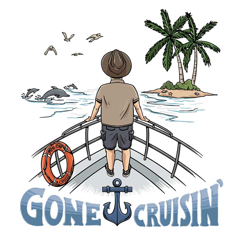 Sometimes, the best out-of-office message is a t-shirt. Our “Gone Cruisin’” tee captures that blissful moment when the shore fades away and vacation mode takes over. Featuring a tranquil deckside scene with palm trees, ocean views, and a calm cruiser gazing at paradise, this shirt is perfect for those who cruise to unwind.
