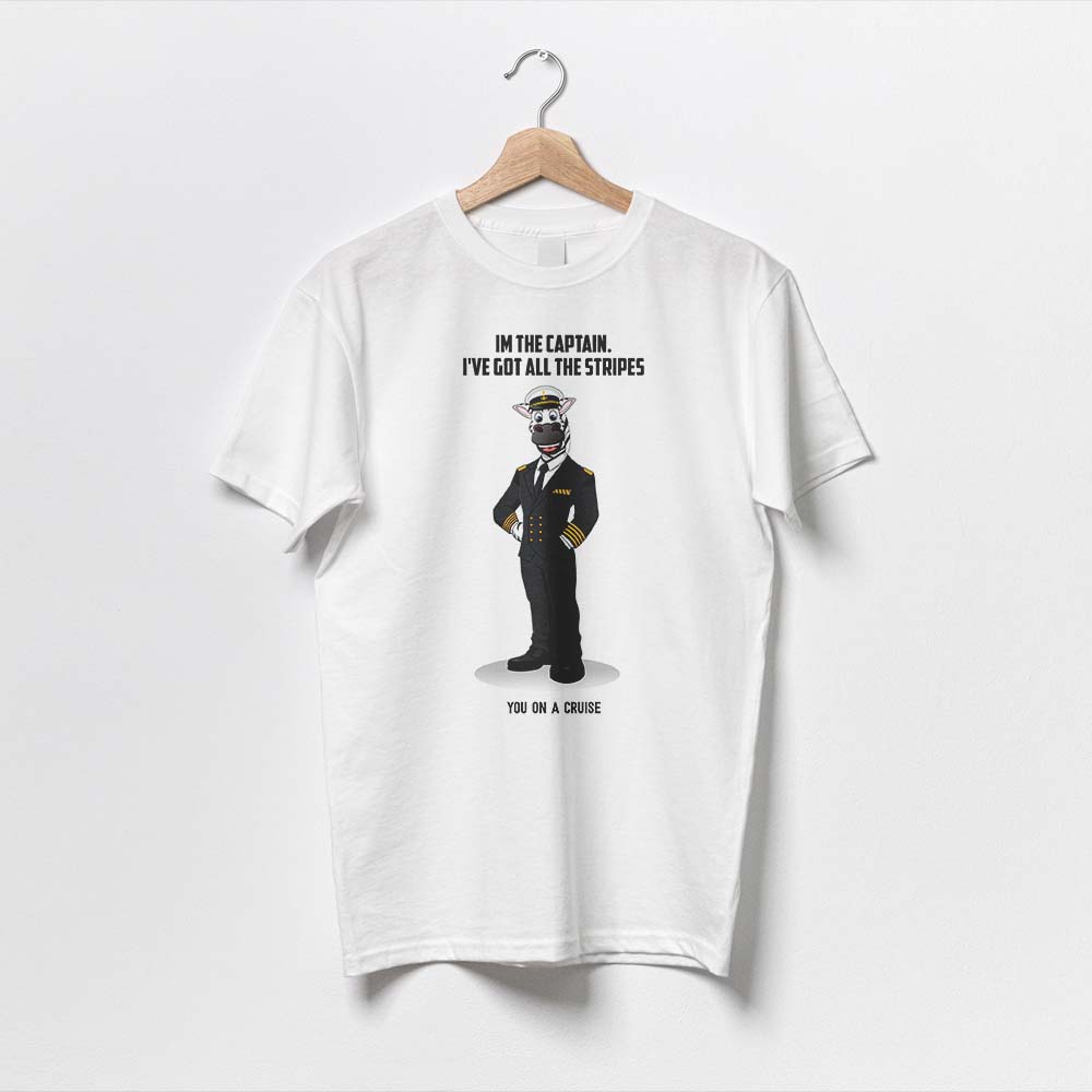 Command the deck (or at least the buffet line) in this hilarious “I’m the Captain. I’ve Got All the Stripes” t-shirt. With a slick, suited-up cartoon captain rocking every stripe possible, this shirt is a perfect pick for cruise lovers who like being in charge of the party.